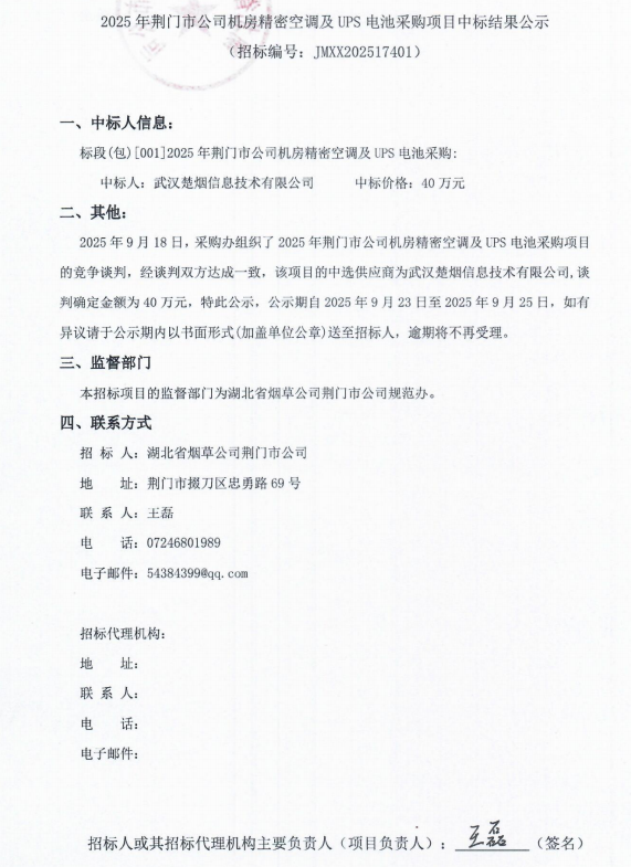 2025年荆门市公司机房精密空调及UPS电池采购项目中标结果公示